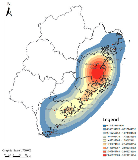 As indicated in Table 1 (weights), within the accessibility dimension, the indicators “distance to the nearest Wei citadel” (0.146) and “distance to the nearest Suo citadel” (0.182) have the highest weight values, far surpassing indicators like the “number of naval fortresses (Shuizhai)” (0.007) and “number of beacon stations (Fenghou)” (0.006). This underscores the importance of spatial accessibility as a primary factor driving defence effectiveness. As the economic centre, the central coastal defence sector in Fujian, which was frequently targeted by Wokou pirates, exhibited distinct independent defence characteristics. Consequently, its Wei-Suo, such as Quanzhou Wei (70.23) and Meihua Suo (70.84), recorded significantly higher defence scores compared to other regions.