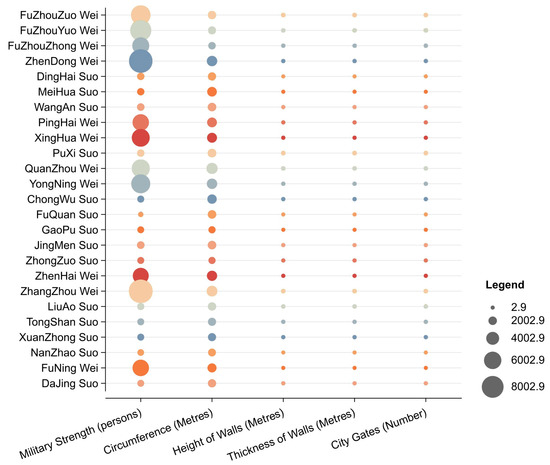 Defensive parameters, such as perimeter, wall height, wall thickness, and the number of gates, recorded in historical sources, were converted to metric units and standardized for comparative analysis across the Wei citadels (Figure 8; detailed data in Appendix Table A1). This standardization creates a consistent, quantitative baseline for subsequent evaluations and comparisons.