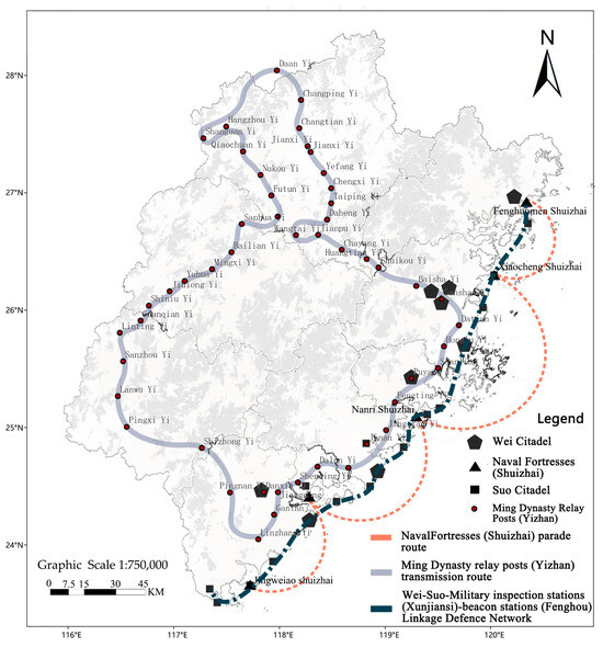 Fujian’s coastline, with an indentation ratio of 0.18 (1:5.7), is the most deeply indented in China. This complex terrain provided opportunities for pirate concealment and landing, while regions such as the Min River estuary, lacking natural barriers, were particularly vulnerable. In response to these challenges, the Ming court implemented the “Five Naval Fortresses (Shuizhai) System,” which significantly enhanced regional security. In 1388 (the 21st year of the Hongwu reign), Zhou Dexing was appointed to oversee Fujian’s defences, adhering to the guiding principles of “defending the seas, fortifying the coasts, strengthening city defences, and maintaining vigilant lookouts” [4]. His efforts resulted in the construction of 11 Wei citadels, 14 Suo citadels, 67 inspection stations, and five naval fortresses, forming a multi-layered, in-depth defensive network (Figure 1). This system integrated naval patrols, beacon stations (Fenghou), and Ming Dynasty Relay Posts (Yizhan), surpassing the traditional single-layer defence model and achieving coordinated land–sea defence.