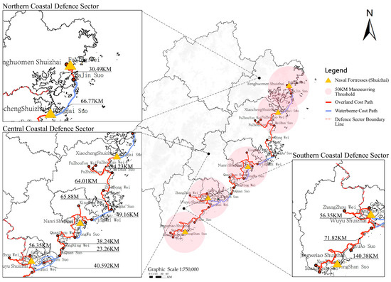 To evaluate wartime joint defence accessibility, we employed GIS-based least cost path (LCP) analysis, integrating both maritime and overland routes to compute the minimum travel cost distances between neighbouring sites (Figure 10; Appendix Table A2). Maritime support routes were derived from historical sailing records. The Illustrated Map of Coastal Defence Against Wokou during the Jiajing Reign highlights key patrol sectors for the Ming fleet, such as the Min River Estuary–Xinghua Bay and Quanzhou Bay–Xiamen Bay. Chouhai Tubian also mentions that naval fortresses (Shuizhai) “occupied strategic chokepoints and mutually supported one another,” underscoring the dependence on sea lanes for joint defence (Figure 11). Using these recorded routes and port nodes, we integrated coastline morphology and bathymetry in ArcMap 10.5 to construct a cost raster and spatialize traditional maritime support corridors for Fujian’s coastal Wei-Suo.