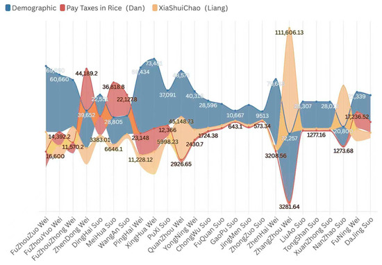 As illustrated in Figure 13 and Figure 14 (Appendix Table A4), significant regional patterns in population and taxation are observed within the Fujian Wei-Suo system. (i) Troop distribution was relatively balanced across the three coastal defence sectors, with Wei citadels bearing significantly higher troop loads compared to Suo citadels, which aligns with the institutional scale of Wei citadels. (ii) Economically, Zhangzhou Wei in the southern coastal defence sector stands out, with the highest proportion of Summer Tax Silver (tael). This reflects Yuegang’s role as the only legally sanctioned civilian foreign-trade port in the Ming Dynasty, positioning it as a key national trade hub. (iii) In terms of Rice Tax (Dan), the central coastal defence sector enjoyed the greatest advantages due to its stronger administrative system and favourable geographical and fiscal conditions. In contrast, the northern and southern coastal defence sectors faced challenges, including fragmented farmland resulting from mountainous terrain, which led to inefficient tax and grain collection systems. As a result, these areas lagged behind the central coastal defence sector in terms of overall administrative and fiscal efficiency.