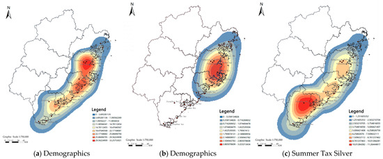 Kernel density of (a) demographics, (b) Rice Tax (Dan), and (c) Summer Tax Silver (tael) at the Wei-Suo level.