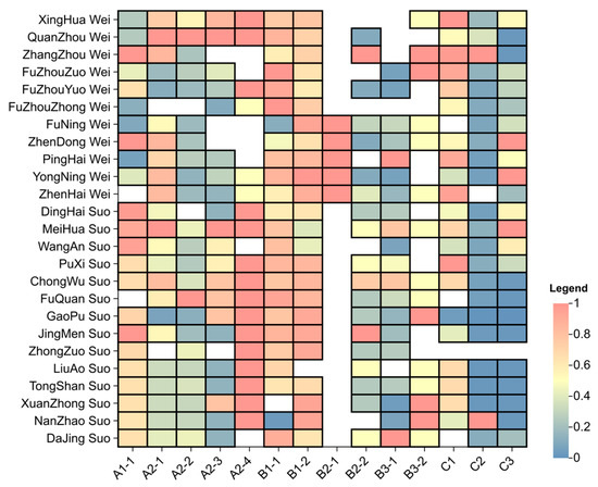 When analysing the defensive evaluation factors of the Wei citadels, it is essential to preprocess the raw data using range normalization. For positively oriented indicators, linear normalization was applied, meaning the higher the value of the relevant evaluation factor, the stronger the citadel’s defensive capability. Conversely, for negatively oriented indicators, a directional transformation was performed: the larger the value, the weaker the joint combat capability. This method eliminates dimensional differences across multi-dimensional indicators, compressing the values of all evaluation factors into a standardized range of [0, 1]. Additionally, through polarity adjustment, all indicators were aligned such that larger values consistently correspond to stronger defence capabilities. This normalization process provides a bias-free data foundation for subsequent Analytic Hierarchy Process (AHP) analyses. For further details, see Figure 15 (detailed data in Appendix Table A5).