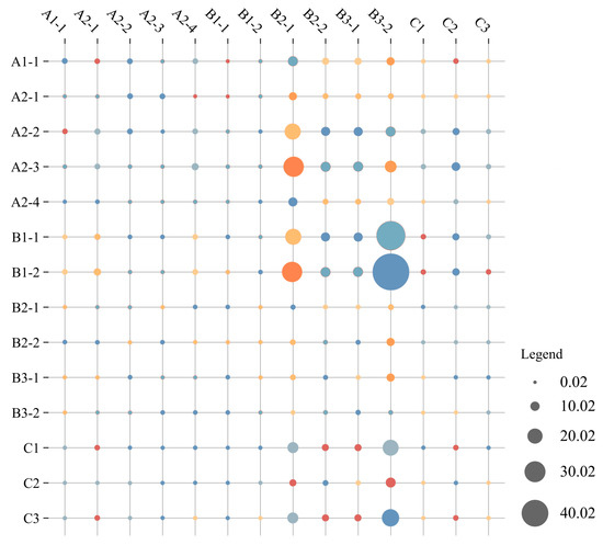 - Based on expert surveys, a pairwise comparison judgment matrix was constructed (Figure 16, with detailed data in Appendix Table A6). The consistency of this matrix was then tested. The maximum eigenvalue of the matrix, λ_max = 14.5073126, resulted in a consistency index (C.I.) of 0.039024. Given that this study involves a 14-order matrix, the average random consistency index (R.I.) is 1.58. Substituting this value into the formula, the consistency ratio (C.R.) was calculated as 0.06165792, which is below the threshold of 0.1, indicating that the judgment matrix passed the consistency test [45].