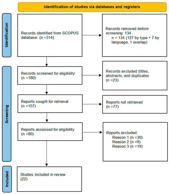The PRISMA 2020 statement was used to develop the protocol [58]. A total of 314 papers from the SCOPUS database were found in the first search, as can be seen in the PRISMA flow diagram (Figure 2). The dataset was first cleaned up by removing duplicate entries (n = 134), and then 180 articles were examined for eligibility. During the screening phase, 23 publications were removed for a variety of reasons, including duplicates (n = 4), abstracts (n = 12) that lacked any of the primary keywords of the current study (entrepreneurship, SDGs and digitalization, or digital technologies), and unrelated titles (n = 7). Due to inadequate data, 77 of the 157 items that were requested could not be obtained. Then, eligibility was assessed for 80 articles.
