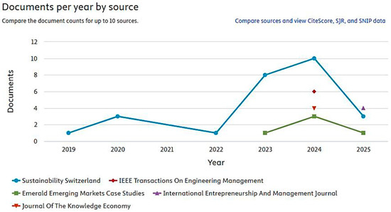 By supplementing the bibliometric analysis of all articles identified in the Scopus database, it is possible to map the evolution and trends of research in the field of entrepreneurship, digital transformation, and sustainable development. All data were extracted from the Scopus database and mapped using the VOS Viewer tool, thus providing a quantitative overview that complements the qualitative findings. Figure 1, which describes the annual distribution of publications, shows a significant increase in the number of articles after 2019, peaking in the three-year period of 2022–2024. This trend confirms the intensification of academic interest in the integration of the three research fields. Furthermore, Figure 3 shows that the journal Sustainability dominates as a source of publications (26 articles), which highlights the field’s focus on sustainability issues in combination with technological innovation.