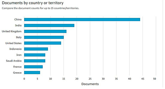 With regard to countries that have conducted research in this field, Figure 4 shows that China is significantly ahead (44 articles), followed by India (19), the United Kingdom (16), Italy (15), and the United States (14). The presence of countries from all continents demonstrates that the study of digital entrepreneurship and sustainable development is a global research interest, with variations that probably reflect national policies, levels of technological maturity, and socio-economic priorities.