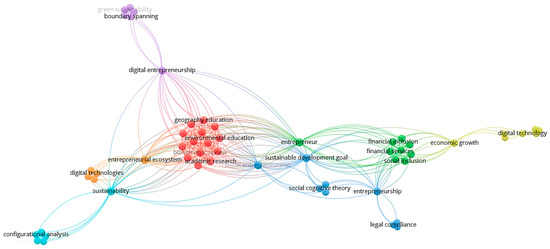 An additional element that reinforces the findings of this literature review concerns the thematic representation of research output through bibliometric mapping using the VOSviewer tool (Figure 5). Through the analysis of the co-occurrence network, seven distinct thematic clusters emerge that reflect the most frequent research correlations. The terms “digital entrepreneurship,” “sustainable development goal,” “entrepreneurial ecosystem,” “economic growth,” and “digital technologies” occupy a central position in the network, confirming the close relationship between digital transformation, entrepreneurship, and sustainability. In addition, the interconnections between social inclusion and financial integration are also visible, as are theoretical references to concepts such as “social cognitive theory” and “academic research,” highlighting both the applied and theoretical dimensions of the field.