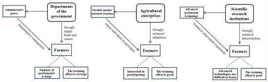 Analysis of organizational behavior and factor endowment shows that, as a representative of public welfare, the government agricultural extension department has the most financial support for training, and it can effectively guarantee the number of participants by relying on the promotion of administrative orders. It plays an irreplaceably important role in training related to regional agricultural industrialization, joint prevention, and the treatment of diseases and pests [52]. Nevertheless, there is a the lack of awareness of the technical needs of farmers and low efficiency of collaboration [56], and unclear responsibilities and low regulatory benefits of the current agricultural technology promotion departments [53,57,58]. Moreover, the internal motivation of behavior is insufficient, and the overall training ability is general. As representatives of quasi-public welfare, agricultural universities and scientific talent cultivation have the highest quality of training personnel and the largest number of technical achievements. However, experts and professors in the field of agricultural discipline focus more on theory than practice. Although agricultural scientific research achievements are abundant, it is difficult to apply them to production practice [59,60]. Moreover, they do not have strong independent promotion ability, training attraction, interaction ability, and environmental adaptation ability to go deep into rural areas. The combination of effectiveness, practicality, and reality of technical training carried out by such organization is slightly insufficient, and the overall training situation is not good. Figure 1 shows the connection between three types of technical training organizations and farmers.