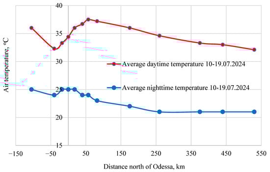 A heatwave, defined as a period in which the daily maximum temperature exceeds the maximum temperature norm by 5 °C for more than five consecutive days [2,26], occurred in Odesa from 10 July 2024, when the temperature exceeded the norm by 7.7 °C, to 19 July, when the temperature exceeded the norm by 6.4 °C. Data from the meteorological station in Odesa and 12 locations along the meridian profiles (9 north and 3 south of the coast) were used to assess the impact of the heatwave on the city’s temperature. The distribution of daily maximum temperatures between 10 July and 19 July 2024 is shown in Figure 1.