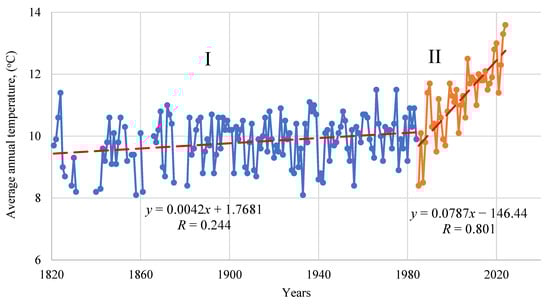 Data on the average annual temperature in Odesa between 1820 and 2024 [36] was used to analyze temperature changes. Trends in average annual temperatures are shown in Figure 2.