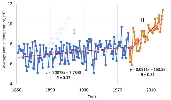 As can be seen from the changes in average annual temperatures over time, a characteristic feature of the series is a sharp increase in the parameter after 1985. For comparison, similar data [42] for the city of Kyiv for the same period were analyzed (Figure 3). The data showed similar trends in the time series.
