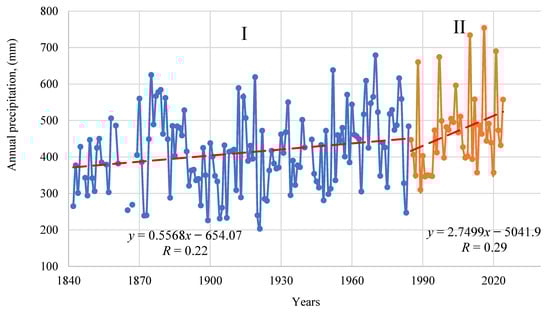 Trends in average annual precipitation. Changes in the amount of precipitation in Odesa are shown in Figure 4. For comparability with trends in average annual temperatures, the time series of average annual precipitation is also presented for two similar periods.