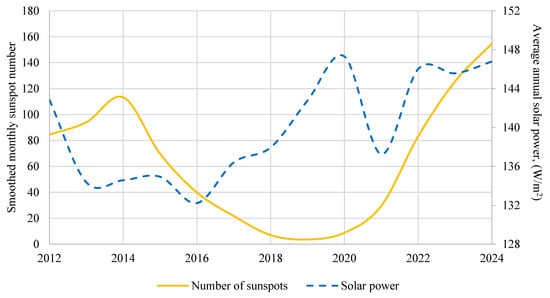 Time series of solar energy power based on data from the Davis Vantage Pro2 weather station and a time series of the smoothed monthly number of sunspots according to the National Belgian Observatory (Royal Observatory, 2025 [43]).