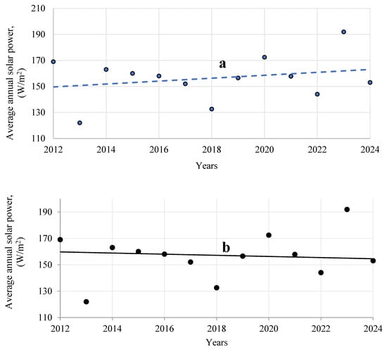 In general, the observed fluctuations in solar power may coincide with changes in solar activity. However, as shown by data from the Belgian National Observatory in Figure 5, changes in solar activity during this period do not correlate with solar energy time series. Even the maximum recorded power value in 2020 corresponds to the minimum number of sunspots. The significant decrease in solar power in 2021 after an increase in 2016–2020 can be explained by the sharp, almost twofold increase in precipitation in those years, as shown in Figure 4. In terms of monthly patterns, the largest increase in solar power is observed in October–November, as well as in February (Table 6). Long-term observations and statistical analysis of changes in solar radiation intensity enable the determination of solar radiation distribution in urban areas, which is of practical importance for the development of sustainable energy, infrastructure planning, and improving the energy efficiency of buildings.