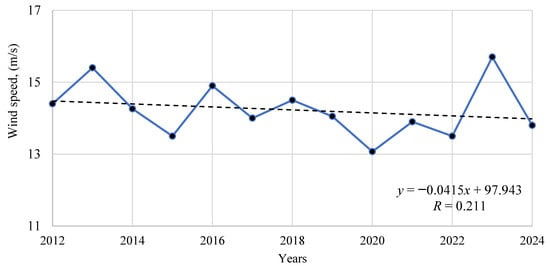 Different criteria sometimes show different directions. This is due to the different principles of constructing trend lines in these tests. Figure 6 shows the trend lines for solar power capacity for September, which have different signs. Figure 7 presents time series of annual average and maximum wind speeds in Odesa.