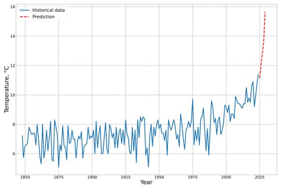 Figure 8 presents the results of modeling the average annual air temperature based on historical observations combined with a forecast for the next five years, obtained using a hybrid model.