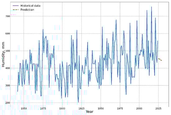 The blue line in Figure 9 represents historical observations of average annual humidity, while the red line shows forecasted values. According to the results, the model indicates a gradual but steady decline in humidity levels over the forecast period. If the average annual humidity in 2025 is 455 mm, it decreases to 445 mm by 2029. This suggests a potential trend toward drying or reduced precipitation.
