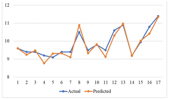 Around points 4 (deviation 4.35%), 7 (deviation 3.19%), and 11 (deviation 4.21%), the prediction slightly underestimates compared to the actual values. At points 8 (deviation 3.81%) and 13 (deviation 0.92%), the model overshoots a little. At the end (points 14–17), the predicted and actual values are almost identical. The model not only matches the absolute values but also correctly follows the direction of changes—peaks, dips, and steady segments.