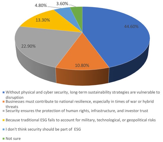 This study set out to examine whether security should be conceptualized as a distinct dimension within the ESG framework. By combining theoretical analysis with empirical evidence from a nationwide survey in Ukraine, we demonstrated that security operates as a prerequisite for sustainable development rather than as a subsidiary element of existing ESG pillars.