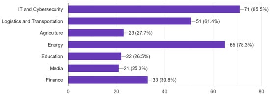 The survey employed a non-probability purposive sampling strategy, targeting individuals with actual or potential experience in ESG- or security-related practices. A total of 83 responses were collected from representatives of four key sectors: business, public administration, education, and civil society. This sample composition was determined by the strategic role these sectors play in fostering both national and corporate resilience. Data collection ensured respondent anonymity and voluntary participation. Due to the non-interventionary nature of the study and the absence of personal identifiers, formal ethical approval was not required.