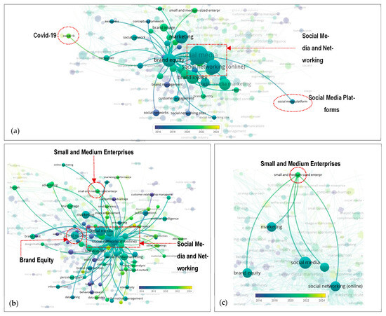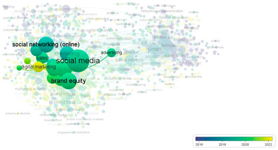As observed in the network presented in Figure 4, it can be concluded that as the year 2024 approaches, studies increasingly shift toward digital marketing. This area has established a strong connection with brand equity and social networks. Furthermore, interdisciplinary research in recent years suggests that digital marketing and the use of social networks will become prominent and innovative solutions in the field of marketing in the future.