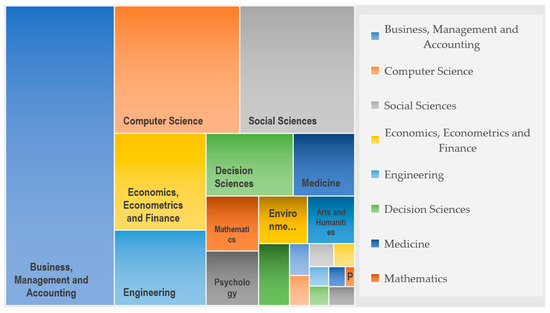 Figure 5 shows that there are 882 articles related to business, management, and accounting, followed by computer science with 432 results and social and behavioral sciences with 397 results. These statistics can help researchers and professionals in these fields identify the best sources and relevant components related to brand enhancement and branding through social media for KBEs, enabling them to utilize these resources effectively in their studies and investigations.