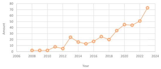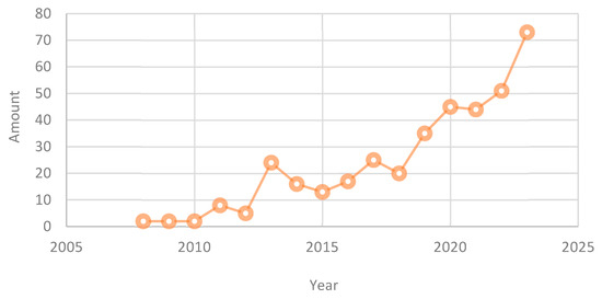 Figure 9 illustrates the steady growth in the number of articles published in this field from 2008 onwards. This trend reflects the academic community’s growing emphasis on the significance of social media in enhancing a company’s brand equity, particularly for SMEs. According to Figure 9, significant growth is observed in the 2012–2013 period, followed by a decline from 2014 onwards. Furthermore, with the onset of the COVID-19 pandemic, the growth rate sharply decreased [26]. However, in early 2024, significant and explosive growth in research activity was observed, indicating significant shifts in attention and activities related to this area.