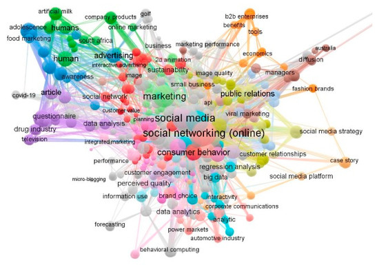 To identify the most relevant articles aligned with the research objectives, keywords related to brand equity concepts were first extracted from the Scopus database, followed by keywords related to social media. As illustrated in Figure 1, the articles were analyzed using the VOSviewer software to identify their interconnections. Subsequently, all data related to the articles were analyzed, and relevant data visualizations were created.