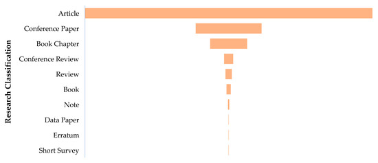 According to Figure 7, the highest number of results corresponds to journal articles, totaling 1083 results. The following are conference papers with 248 results, book chapters with 139 results, and other types of studies of greater significance than books and other study formats. Based on Figure 8 and the large number of valid academic articles, it is possible to form a more comprehensive literature review in the field [24] of brand equity and social media. However, few studies have been conducted in the area of KBEs and SMEs, although these studies have increased recently.