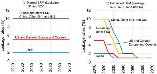 The assumed leakage rates for refrigerants during operation are shown in Figure 2. As indicated, S-1 and S2-1 feature a constant leakage rate until the year 2070. The leakage rate for Japan in S-1 and S2-1 is 2% (the rate that appeared in the government’s 2008 report). Although this 2% value has not been revised since 2008, scenarios S2-2, S2-3, S2-4, and S3 assume that improvements in design and manufacturing quality, construction technology, and service quality will reduce the leakage rate to 1% by 2030. The assumptions were based on the trend that the average leakage rate of all equipment will decrease over time due to decreases in leakage rates of newly installed equipment [34]. For the other countries, the leakage rate was set according to the IPCC’s GHG emission calculation guidelines. It should be noted that these assumptions, considering economic factors and insufficient qualification of personnel, are not supported by empirical verification. Other countries are expected to promote LRM in order to achieve their KA targets: S2-2, S2-3, S2-4, and S3 assume that the leakage rates in all countries will improve.