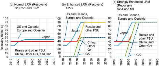 S2-3 represents a world in which environmental concerns are given greater importance and recovery rates are significantly improved based on the incremental targets of the KA. S2-3 assumes recovery rates up to 90% for developed countries and up to 50% for developing countries. In Japan, the 2022 recovery rates for televisions, washing machines, and refrigerators—the three items covered by the Home Appliance Recycling Law—were 93.4%, 92.5%, and 87.7%, respectively [36]. Given the high recovery rates for these three items, a rate of 90% for ACs is considered to be perfectly feasible for developed countries. Until now, relatively little attention has been paid to the recovery of refrigerants when cooling equipment is disposed of. However, the number of countries promoting legislation related to electronic waste, including managing EOL electrical equipment through regulated collection and material recovery processes, is gradually increasing [37]. Given the growing interest in creating a circular economy, the movement to reduce GHG emissions and to enhance LRM is expected to advance rapidly. In this study, it is assumed that a recovery rate of 50% is attainable in the near future in most countries and that, ultimately, a recovery rate of 90% will be reachable. The regional differences in rates shown in Figure 3 reflect regional differences in the reduction targets set by the KA. Scenario S2-4 features significantly greater improvements than are assumed in S2-3, with recovery rates of 90% for all countries after 2045. We assumed, conservatively, the complete absence of recovery until 2030 in some countries in all scenarios. Future studies will require exploring sensitivity analysis to recovery rates, such as gradual increases in recovery rates.