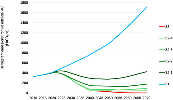 This study simplified the substitution pattern for refrigerants, assuming a sequential transition from R22 to R410A and then to R32 in all the S2 scenarios. Thus, for example, the direct substitution from R22 to R32 (not thorough R410A), for example, was not considered. In the case shifting from R22 to R410A through R410A, cumulative GHG emissions could be higher compared to those direct shift to R32. In addition, GHG emissions could be reduced by approximately 25% compared with those estimated in the simplified scenarios, which assumed R32 only as a medium GWP refrigerant, if R454B, which is a medium GWP refrigerant (GWP: 466) and is widely used in the Unites States, was completely employed instead of R32.
