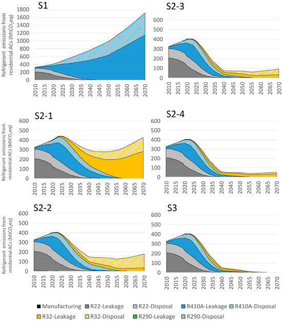 S2-2 features enhanced leakage control (relative to S2-1) during the operation process. Scenario S2-3 adds enhanced recovery control at EOL to the enhanced leakage control in S2-2. In S2-4, the enhanced recovery control is stronger than in S2-3. The effects of these improved recovery measures can be evaluated by comparing S2-2, S2-3, and S2-4. Scenario S-3 features an ultralow GWP refrigerant (R290).