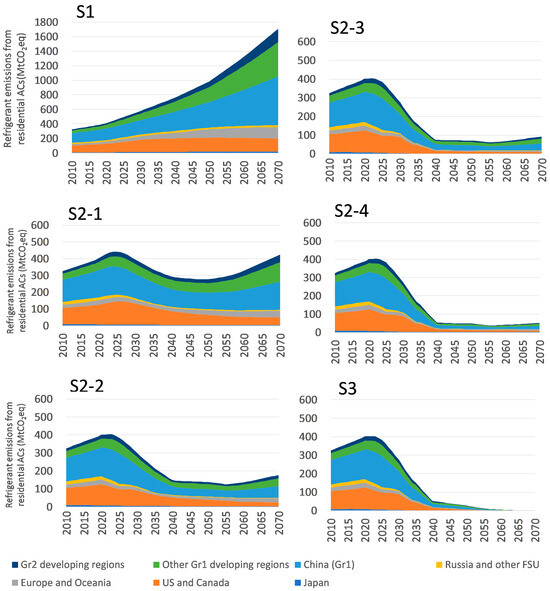 Well-managed measures to promote leakage reduction and refrigerant recovery have not been broadly implemented in most developing countries, meaning that there is significant potential for emissions reduction. To meet the 1% leakage and 50−90% recovery rates assumed in S2-3 and S2-4, there need to be significant changes from the current situation. Meanwhile, in Japan, the current recovery rate for ACs is only around 40%, while the rate for refrigerators and washing machines is approximately 90%. This lower recovery rate for ACs primarily results from their high resource value, which leads to a diversion to informal disposal patterns whereby contractors bypass official recycling routes [42]. Further improvements in recovery at EOL are expected. The promotion of waste management practices for electronic devices, including the implementation of legislation related to electronic waste in some countries, is already underway and is expected to expand significantly in the near future, meaning that the leakage and recovery rates assumed in this study would appear to be highly feasible and ultimately attainable. In order to achieve these goals, however, technical and financial support from international organizations such as UNEP and the Multilateral Fund for the Montreal Protocol (MLF), including capacity-building programs, technology transfer, and funding assistance for developing countries, will be needed.