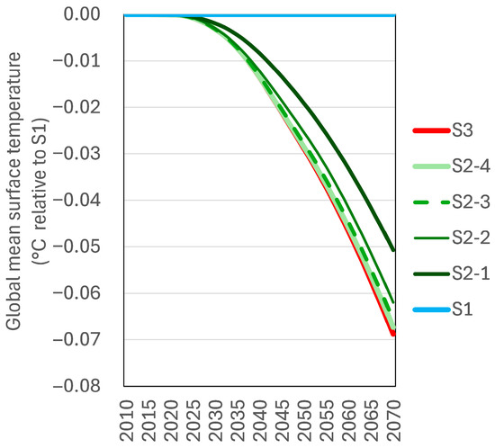 Changes in global mean surface temperature for mitigation scenarios of residential AC refrigerants (°C relative to S1).