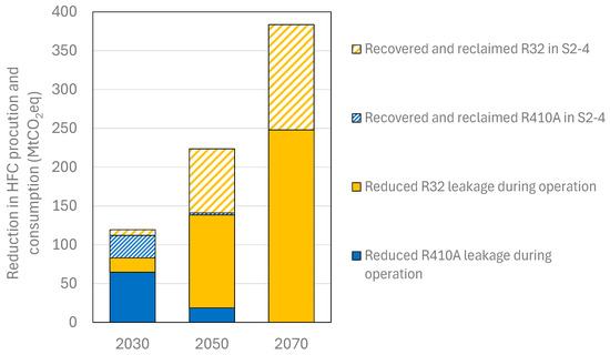 Figure 8 shows the global reductions in HFC production and consumption achieved through enhanced LRM. These global reductions consist of leakage reductions during operation as well as increases in the amount of refrigerant recovered and reclaimed at EOL. The contribution of leakage reductions during operation is calculated as the difference in HFC emissions between S2-1 and S2-2. The contribution of recovery and reclamation at EOL is calculated as 90% of the recovered emissions estimated in S2-4 in all the regions, where the 90% assumption approximately corresponds to the reclamation ratio at facilities for Japan observed in 2023, as reported in [41]. For years when the estimated amount of reclaimed refrigerant exceeds refrigerant demand, the maximum amount of reclaimed refrigerant is constrained by the level of demand; otherwise, the estimated amount of reclaimed refrigerant is applied. The refrigerant demand is assumed to be the sum of the refrigerant put into newly installed ACs and the amount of refrigerant leakage during the operation of existing ACs.