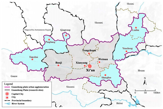 The Guanzhong area in Shaanxi Province, Northwest China, was selected as the study site due to its representative rural housing types and distinctive climatic conditions. Geographically, the region is a valley plain, higher in the north and lower in the center, located between 33°41′–35°39′ N and 106°42′–110°35′ E, covering approximately 56,000 km2. It comprises five prefecture-level cities and 54 counties, with Xi’an as the central hub (Figure 1) [35,36].