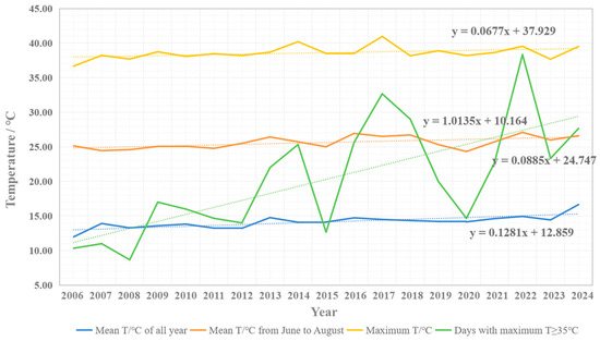 In recent decades, Guanzhong has undergone rapid climatic change linked to global warming. Long-term records from Northwest A&F University indicate a marked increase in extreme heat events over the past 50 years (Table 1) [38]. Rural meteorological station data show that means annual temperature has risen by 0.13 °C per year, while the number of days above 35 °C has increased by about one day per year. Mean summer temperature (June–August) has risen by 0.09 °C per year, reaching 26.61 °C in 2024. Since 2020, increases in mean annual and summer temperatures, along with the frequency of extreme heat days, have accelerated significantly. Variations in outdoor temperature are shown in Figure 2.