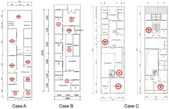 In the traditional courtyard prototype (Case A), the corridor was integrated into the living space, and the former outdoor passage was enclosed (Table 11). The simulated thermal performance sequence (1 > 6 > 10 > 7 > 4 > 9 > 3 > 5 > 8 > 2) was highly consistent with the measured hierarchy: “Kitchen > Bedroom 2/3/Dining room > Living room > Storeroom > Bedroom 1.” Discrepancies originated from boundary conditions: the enclosed northern area blocked the prevailing northeast winds during monitoring, and the storeroom remained closed for prolonged periods—both factors reduced air exchange and slightly altered thermal performance.