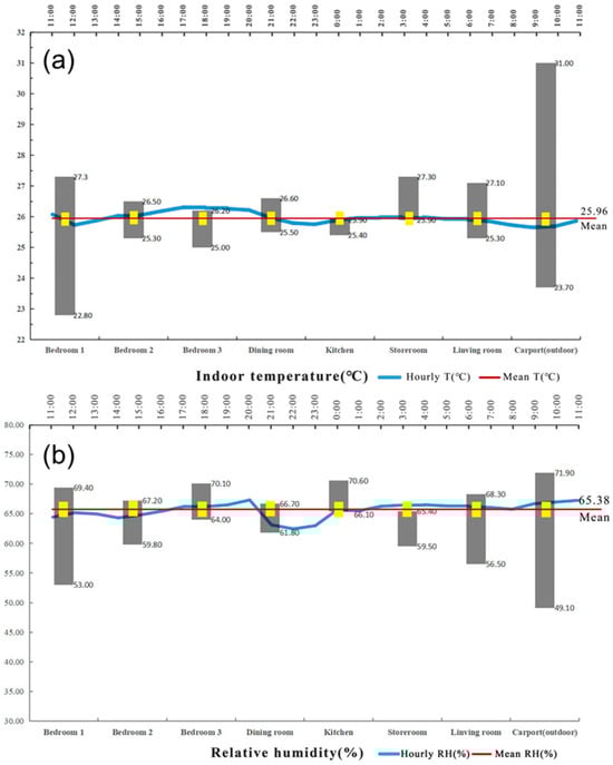 For case A, the monitored spaces comprised three bedrooms, a living room, a dining room, a kitchen, and a storeroom. The average operative temperature (Top) during the monitoring period was 26.0 °C (Tmax = 27.3 °C, Tmin = 22.8 °C), while the average relative humidity (RH) was 65.4% (Hmax = 70.6%, Hmin = 53.0%). Among all monitored spaces, Bedroom 1 exhibited the largest daily fluctuation in thermal conditions (ΔTAs = 4.5 °C, ΔHAs = 16.4%), whereas the kitchen recorded the smallest variation (ΔTAk = 0.5 °C, ΔHAk = 4.9%). These results highlight the influence of room function and position on thermal stability. The indoor thermal environment parameters (Top and RH) of Case A are visualized in Figure 6.