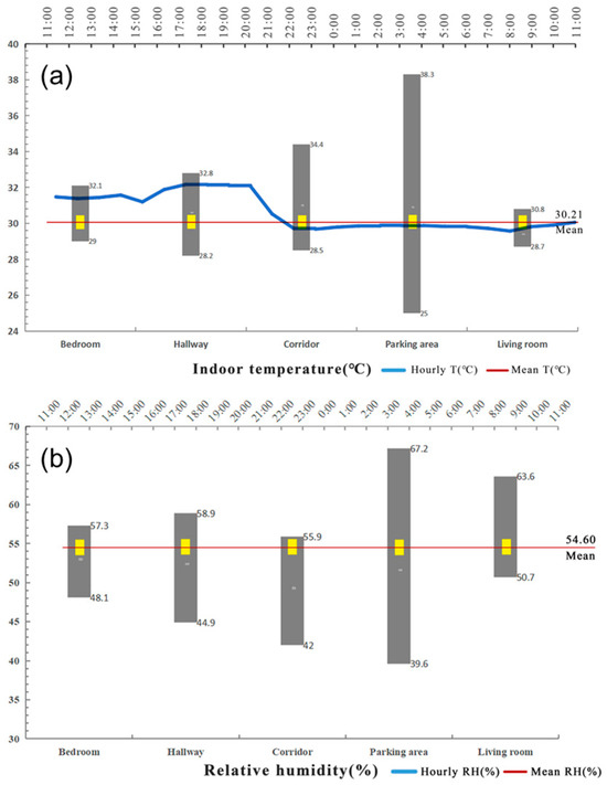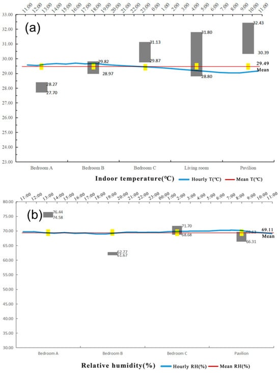 In case B, the monitored spaces included a hallway, a bedroom, a living room, and a corridor. The average Top was 30.2 °C (Tmax = 34.4 °C, Tmin = 28.2 °C), and the average RH was 54.6% (Hmax = 63.6%, Hmin = 42.0%). The corridor exhibited the largest daily variation (ΔTc = 5.9 °C, ΔHc = 13.9%), while the living room recorded the smallest temperature fluctuation (ΔTBb = 2.1 °C). The thermal environment variations of case B are presented in Figure 7. These findings indicate that semi-outdoor or circulation spaces in case B are more susceptible to diurnal thermal changes compared to enclosed living areas.