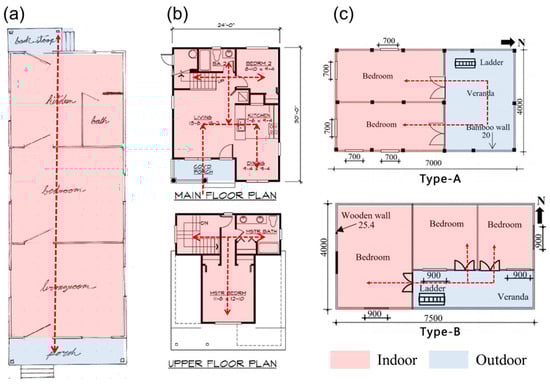 Existing research on indoor thermal environments in rural dwellings can be categorized into three main strands. The first focuses on building envelopes and mechanical systems. Measures, like insulation enhancement, window upgrades, and high-efficiency air-conditioning, have been proven effective in urban settings [8]. However, their high costs, maintenance difficulties, and underdeveloped supply chains restrict their application in self-built rural houses with limited budgets [9]. The second strand emphasizes behavioral adaptation, such as adjusting window opening patterns, using fans, shifting the timing of appliance use, changing clothing, and altering daily routines [10,11]. Yet these behaviors vary greatly across households and seasons, which reduces their replicability and limits their role as design guidelines. The third strand explores spatial configuration, covering building form, layout, façade porosity, window-to-wall ratio, and semi-outdoor spaces such as courtyards, galleries, verandas, and porches [12,13]. Evidence from various regions reveals a common principle: compact building layouts with transitional outdoor elements and balanced proportions can enhance shading and cross-ventilation, thus reducing reliance on mechanical cooling [14]. However, cultural traditions and local technical capabilities vary across regions, resulting in spatially distinct solutions [15,16].