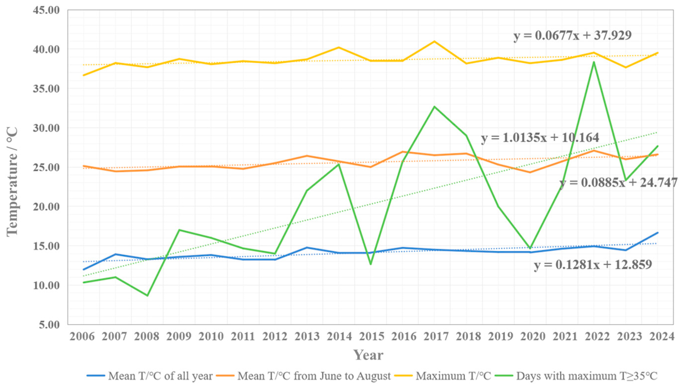 38]. Rural meteorological station data show that means annual temperature has risen by 0.13 °C per year, while the number of days above 35 °C has increased by about one day per year. Mean summer temperature (June–August) has risen by 0.09 °C per year, reaching 26.61 °C in 2024. Since 2020, increases in mean annual and summer temperatures, along with the frequency of extreme heat days, have accelerated significantly. Variations in outdoor temperature are shown in
