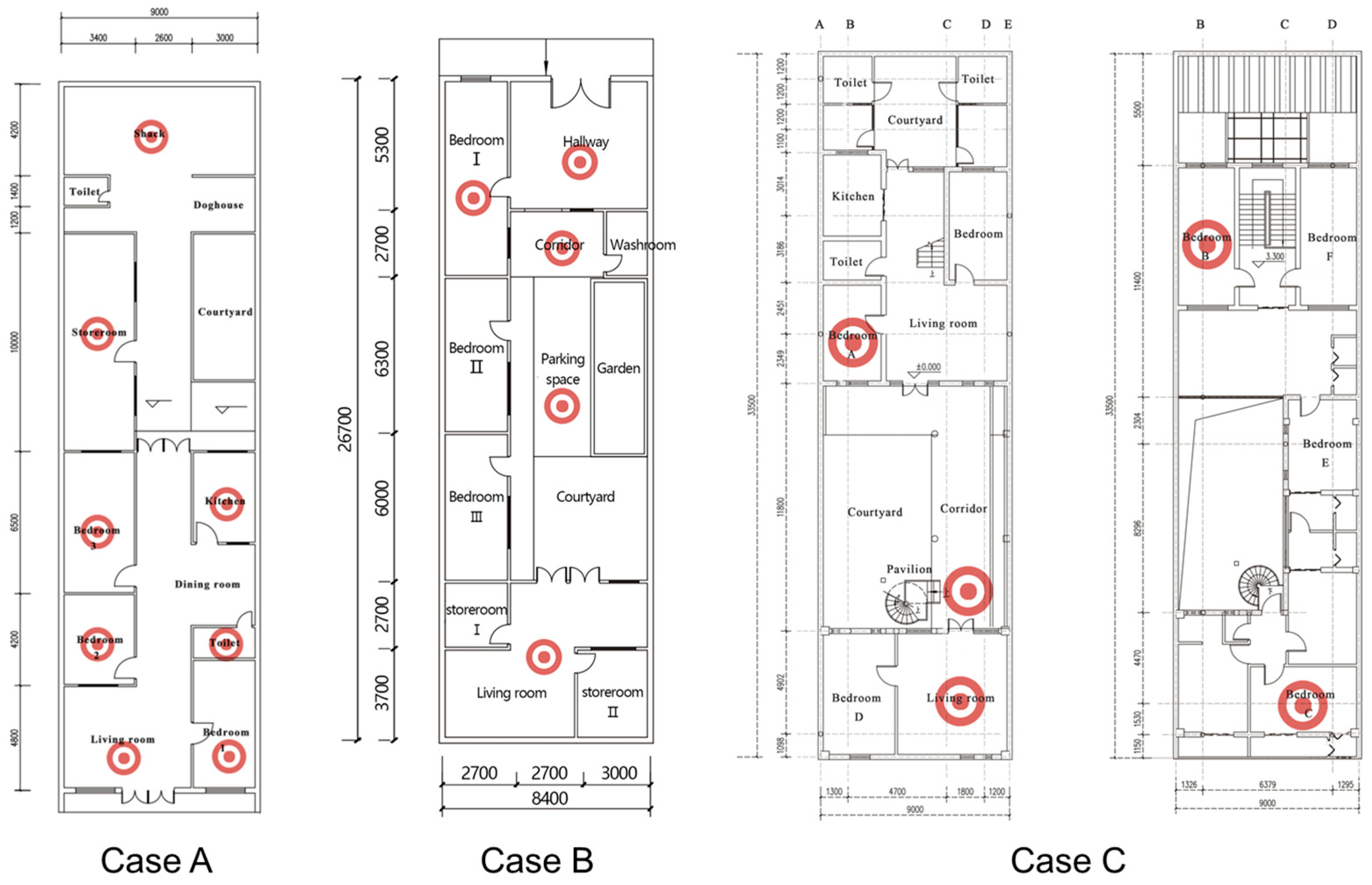To reduce microclimate bias and to enable a one-to-one comparison of spatial prototypes, we monitored three houses in Xuelu Village. Selection proceeded in two steps. First, we built a sampling frame from five years of fieldwork across 30 villages with about 100 mapped households and more than 400,000 thermal records. Second, we chose three houses in the same village that match the three prototypes and satisfy four key criteria: plots and orientations are comparable at about 9 m by 30 m with typical east-to-west spans and north-to-south streets; envelope practice is typical for the region, including masonry walls, concrete or asphalted roofs, and common window types; operation is controllable during monitoring, with no HVAC, no internal heat gains, and unified window and door settings; and local microclimate is consistent within the village, with short distances between cases, safe access for sensors, and owner consent for multi-day monitoring. This selection reduces microclimate variation but does not eliminate it.