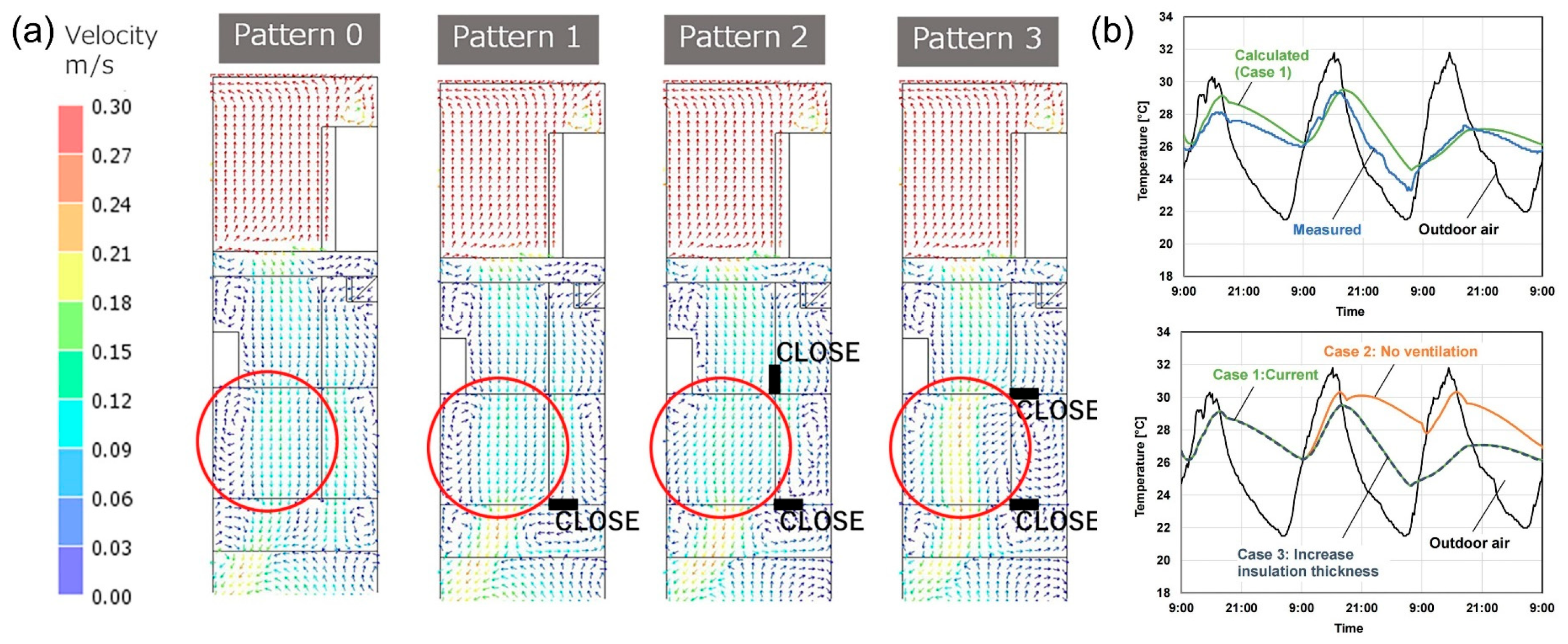 Figure 12. The north and south walls are constructed with 50 mm-thick adobe; the east and west walls include an additional 40 mm-thick wood insulation layer and a 10 mm-thick cedar layer; the roof is composed of 10 mm-thick tiles, 40 mm-thick wood insulation, and 30 mm-thick cedar. Adjusting the configuration of sliding doors redirects airflow and changes indoor temperatures: when ventilation is restricted, indoor temperatures on the second day increase significantly, while additional thickening of the building envelope provides limited improvement. The indoor thermal environment analysis (including wind and temperature simulations) of the Kyo-machiya residence is presented in
