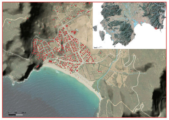 Geographic location of the study area; buildings are in red; detail of hydrographic basin with urbanized area of Solanas.