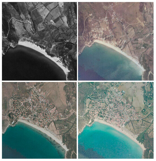 Orthophoto timeseries of the urbanized area of Solanas: 1968 (upper left), 1977 (upper right), 2006 (lower left), and 2019 (lower right).