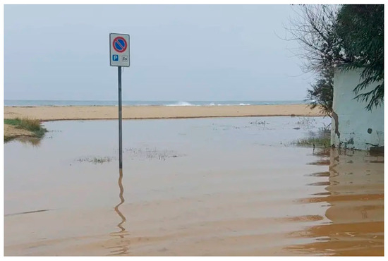 Sardinian coastal areas have been subject to significant anthropogenic pressure and urbanization processes over the past 60 years. The urbanization of Solanas developed extremely rapidly from the 1980s to the end of last century (Figure 2). In 2004, the “save coasts” law was approved, which imposed, as a safeguard measure, the non-buildability of territories within 2 km from the shoreline. However, urban drainage facilities have not upgraded (e.g., larger diameter pipes or storage facilities) consistently with the rapid urbanization growth, resulting in frequent flooding events in Solanas in recent years (Figure 3).