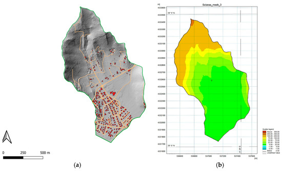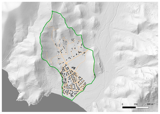 Figure 4. Buildings (gray) and the road network (orange) in the residual basin of Solanas. Limits are green. DTM at 1 m spatial resolution. - The digital model of roads and buildings (Figure 4).